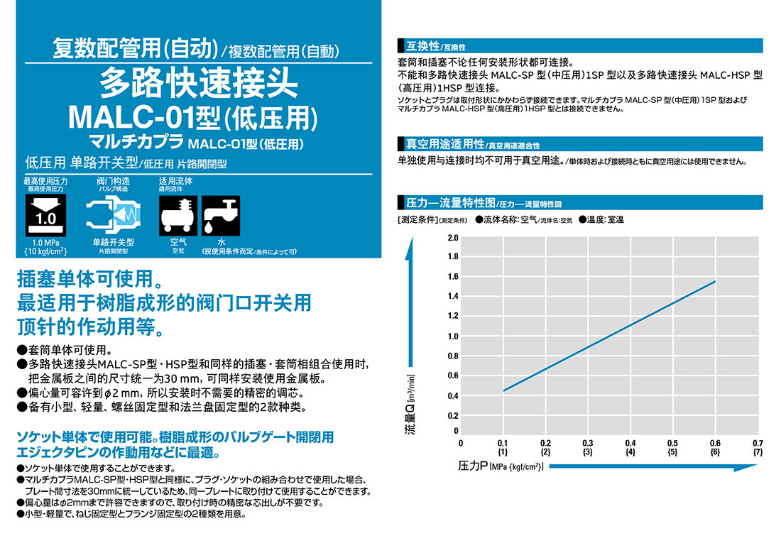 工作壓力:0.7 MPa<br /> 閥門構造:單路開關型<br /> 適用流體:空氣