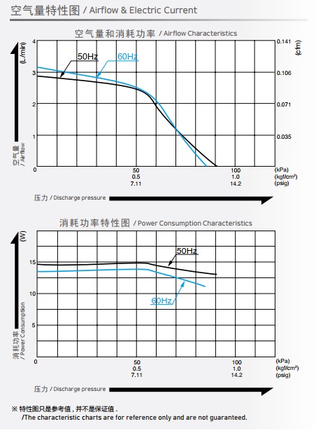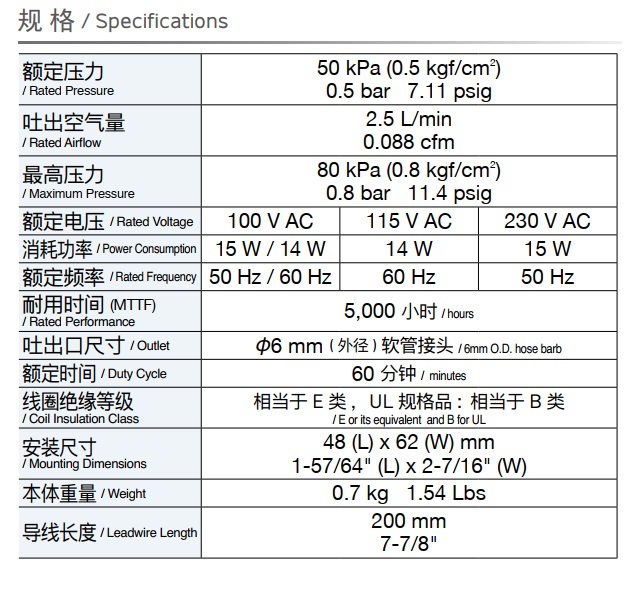 額定壓力:50 kPa (0.5 kgf/cm2)<br /> 最大壓力:80 kPa (0.8 kgf/cm2)<br /> 吐出空氣量:2.5 L/min