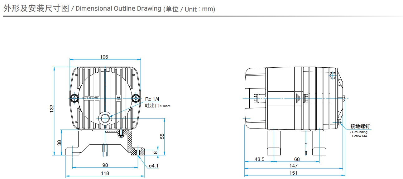 額定壓力: 10 kPa (0.1 kgf/cm2)<br /> 最大壓力: 35 kPa (0.35 kgf/cm2)<br /> 吐出空氣量: 35 L/min