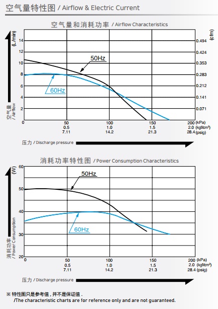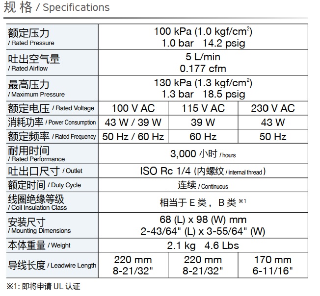 額定壓力:50 kPa (0.5 kgf/cm2)<br /> 最大壓力:80 kPa (0.8 kgf/cm2)<br /> 吐出空氣量:2.5 L/min