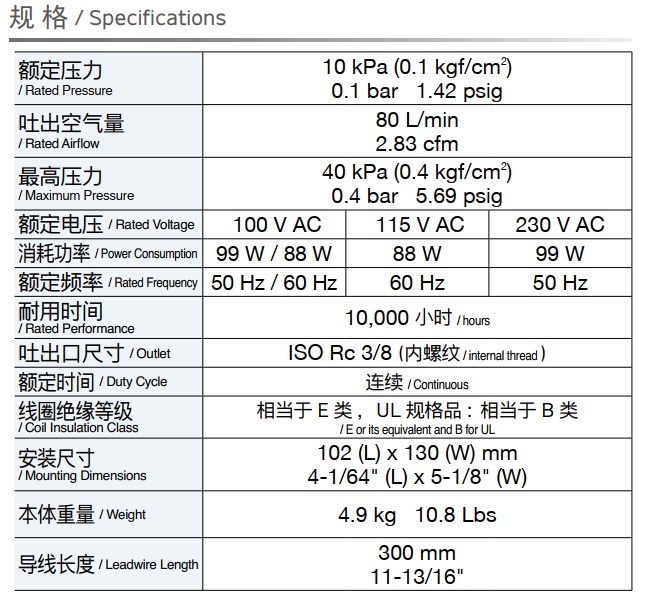額定壓力: 10 kPa (0.1 kgf/cm2)<br /> 最大壓力: 40 kPa (0.4 kgf/cm2)<br /> 吐出空氣量: 80 L/min