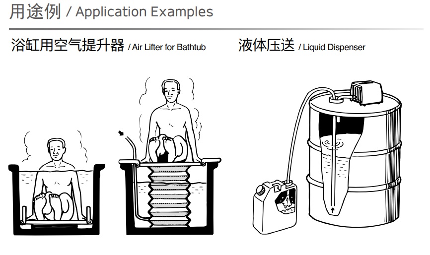 額定壓力: 200 kPa (2.0 kgf/cm2)<br /> 最大壓力: 300 kPa (3.0 kgf/cm2)<br /> 吐出空氣量: 8 L/min