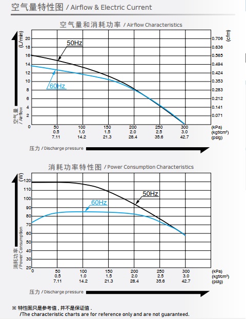 額定壓力:50 kPa (0.5 kgf/cm2)<br /> 最大壓力:80 kPa (0.8 kgf/cm2)<br /> 吐出空氣量:2.5 L/min