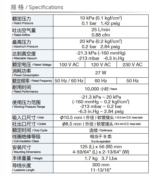 額定壓力:50 kPa (0.5 kgf/cm2)<br /> 最大壓力:80 kPa (0.8 kgf/cm2)<br /> 吐出空氣量:2.5 L/min