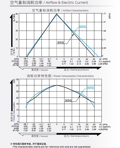 額定壓力: 10 kPa (0.1 kgf/cm2)<br /> 最大壓力: 30 kPa (0.3 kgf/cm2)<br /> 吐出空氣量: 28 L/min