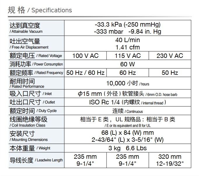 額定壓力:50 kPa (0.5 kgf/cm2)<br /> 最大壓力:80 kPa (0.8 kgf/cm2)<br /> 吐出空氣量:2.5 L/min