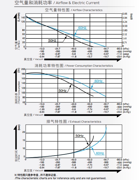 額定壓力: 20 kPa (0.2 kgf/cm2)<br /> 最大壓力: 45 kPa (0.45 kgf/cm2)<br /> 吐出空氣量: 55 L/min