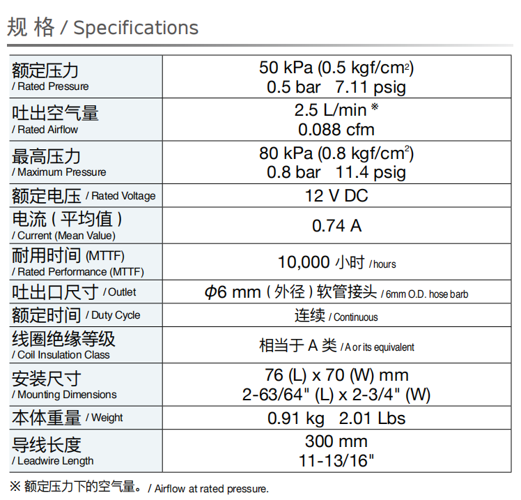 額定壓力: 50 kPa (0.5 kgf/cm2)<br /> 最大壓力: 80 kPa (0.8 kgf/cm2)<br /> 吐出空氣量: 2.5 L/min ※<br /> 額定電壓: 24V