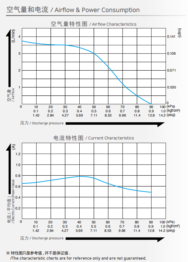 額定壓力: 100 kPa (1.0 kgf/cm2<br /> 最大壓力: 120 kPa (1.2 kgf/cm2)<br /> 吐出空氣量: 1.0 L/min ※<br /> 額定電壓: 24V