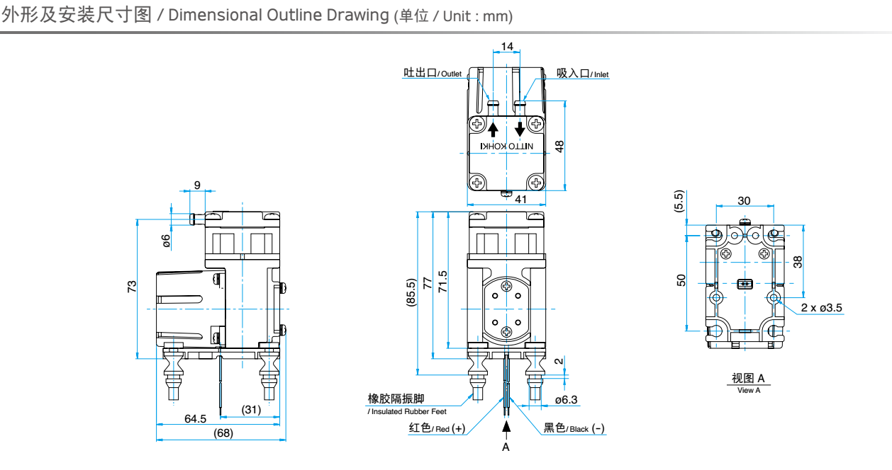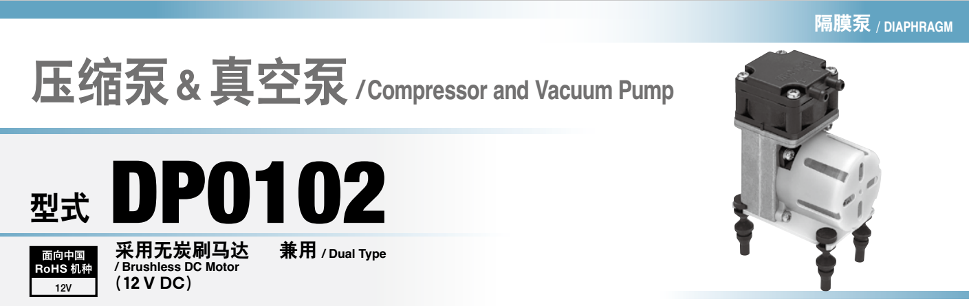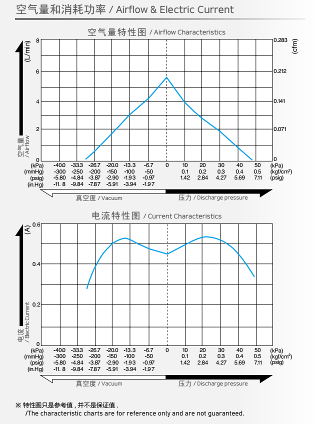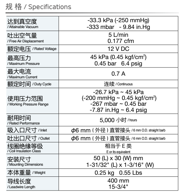 額定壓力: -26.6 kPa (-200mmHg)<br /> 最大壓力: 45 kPa (0.45 kgf/cm2)<br /> 吐出空氣量: 5 L/min<br /> 額定電壓: 12 V DC