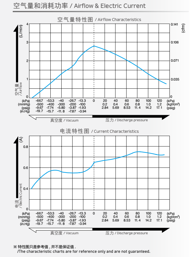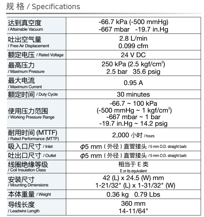 額定壓力: 50 kPa (0.5 kgf/cm2)<br /> 最大壓力: 80 kPa (0.8 kgf/cm2)<br /> 吐出空氣量: 2.5 L/min ※<br /> 額定電壓: 24V