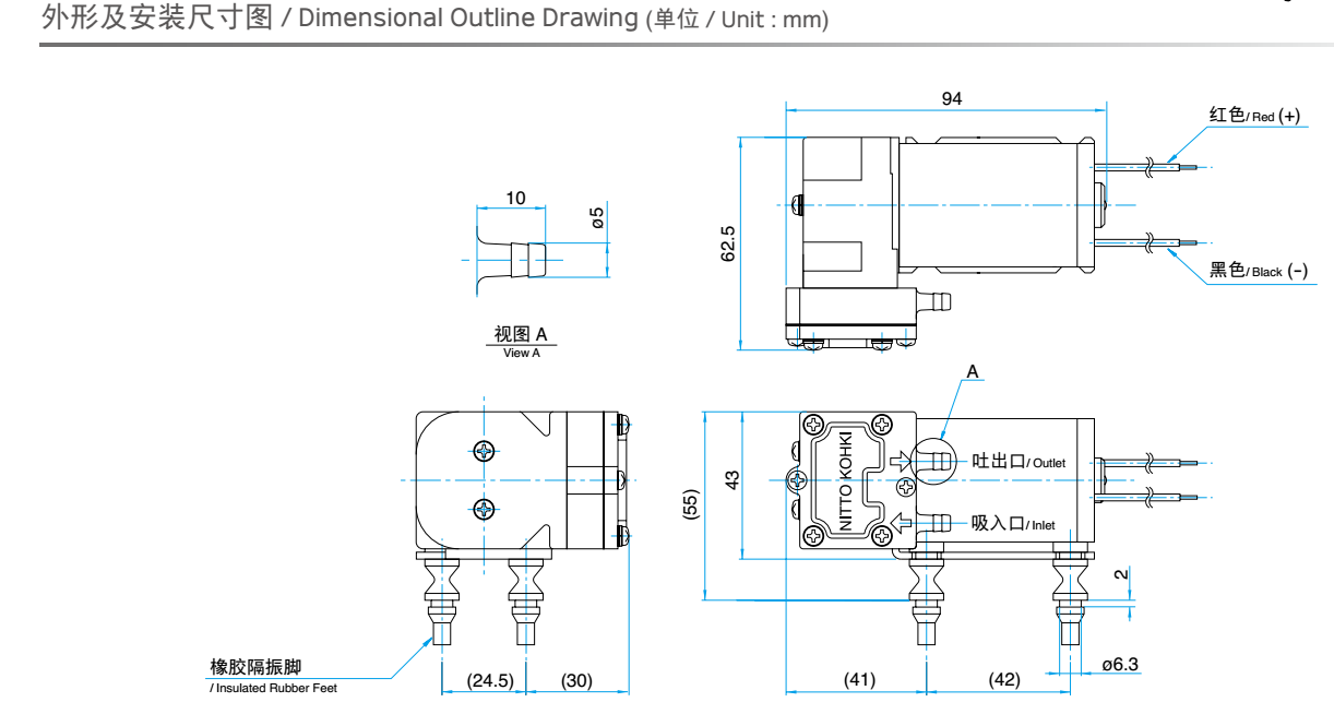 額定壓力: -26.6 kPa (-200mmHg)<br /> 最大壓力: 45 kPa (0.45 kgf/cm2)<br /> 吐出空氣量: 5 L/min<br /> 額定電壓: 12 V DC