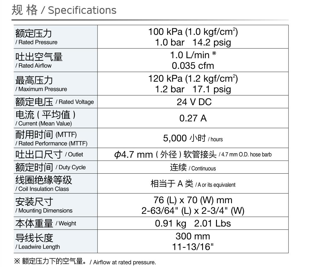 額定壓力: 100 kPa (1.0 kgf/cm2<br /> 最大壓力: 120 kPa (1.2 kgf/cm2)<br /> 吐出空氣量: 1.0 L/min ※<br /> 額定電壓: 24V