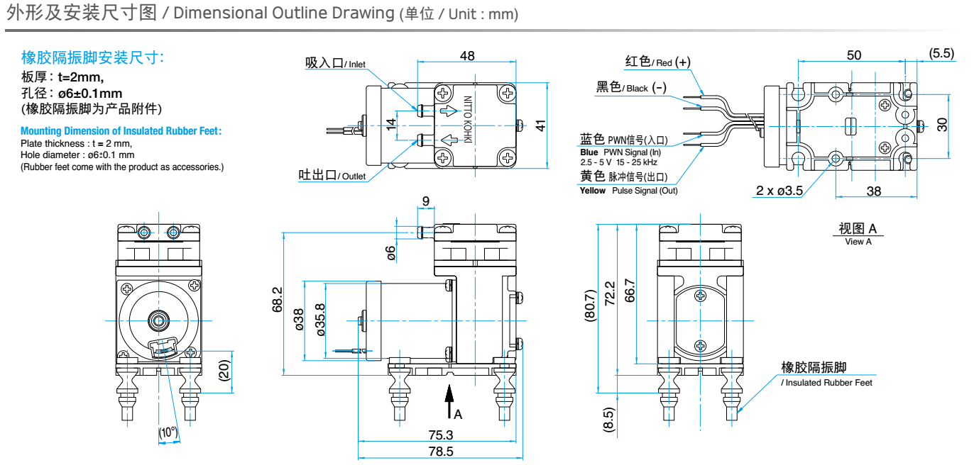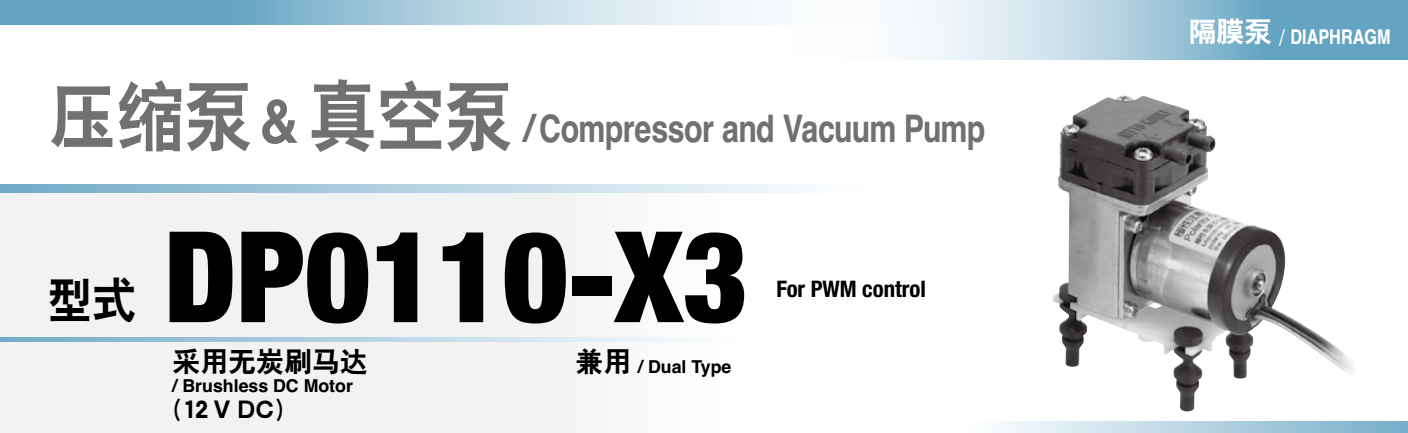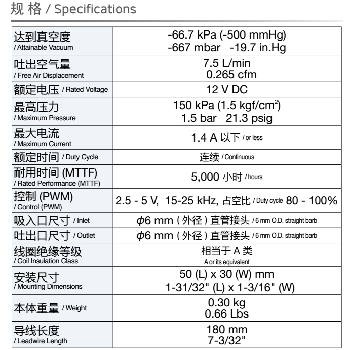 額定壓力: -26.6 kPa (-200mmHg)<br /> 最大壓力: 45 kPa (0.45 kgf/cm2)<br /> 吐出空氣量: 5 L/min<br /> 額定電壓: 12 V DC