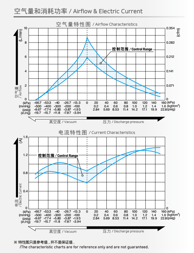 額定壓力: 20 kPa (0.2 kgf/cm2)<br /> 最大壓力: 50 kPa (0.5 kgf/cm2)<br /> 吐出空氣量: 5 L/min ※<br /> 額定電壓: 24V