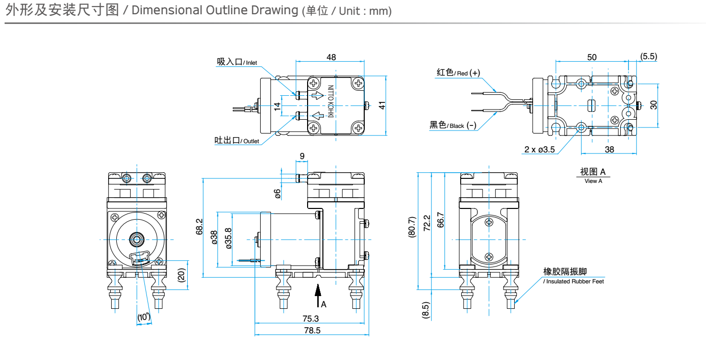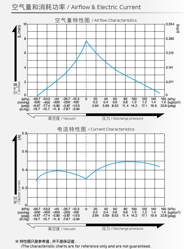 額定壓力: -26.6 kPa (-200mmHg)<br /> 最大壓力: 45 kPa (0.45 kgf/cm2)<br /> 吐出空氣量: 5 L/min<br /> 額定電壓: 12 V DC