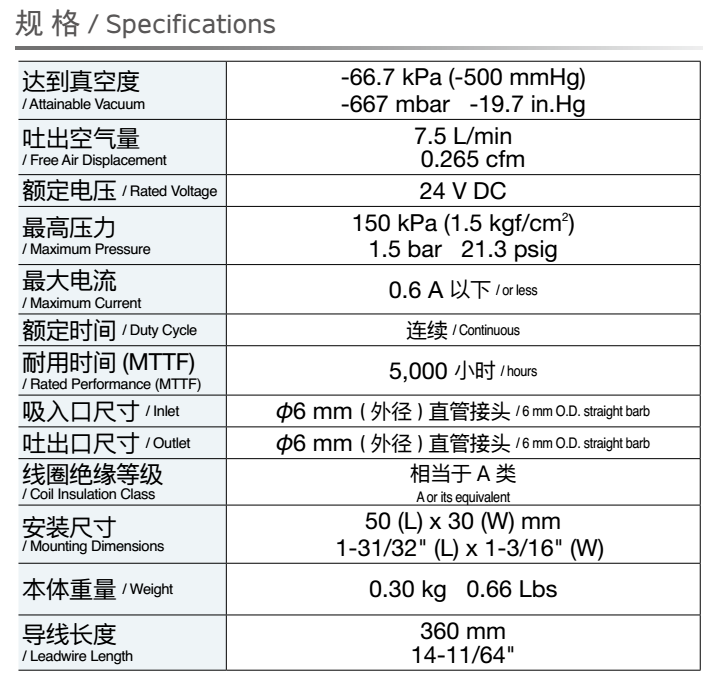 額定壓力: 50 kPa (0.5 kgf/cm2)<br /> 最大壓力: 80 kPa (0.8 kgf/cm2)<br /> 吐出空氣量: 2.5 L/min ※<br /> 額定電壓: 24V