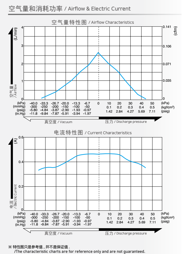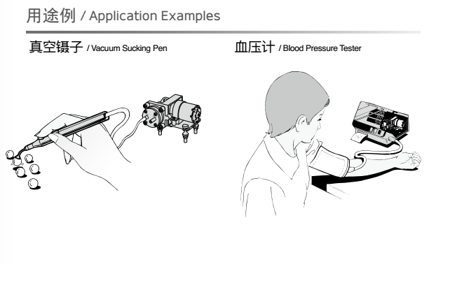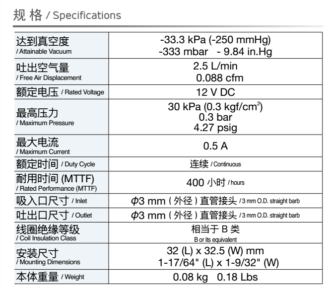 額定壓力: -26.6 kPa (-200mmHg)<br /> 最大壓力: 45 kPa (0.45 kgf/cm2)<br /> 吐出空氣量: 5 L/min<br /> 額定電壓: 12 V DC