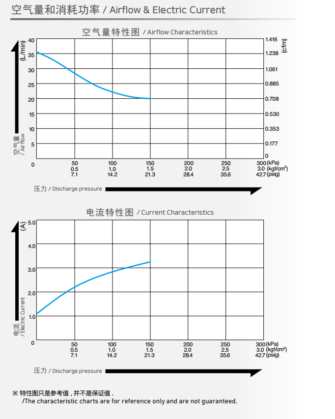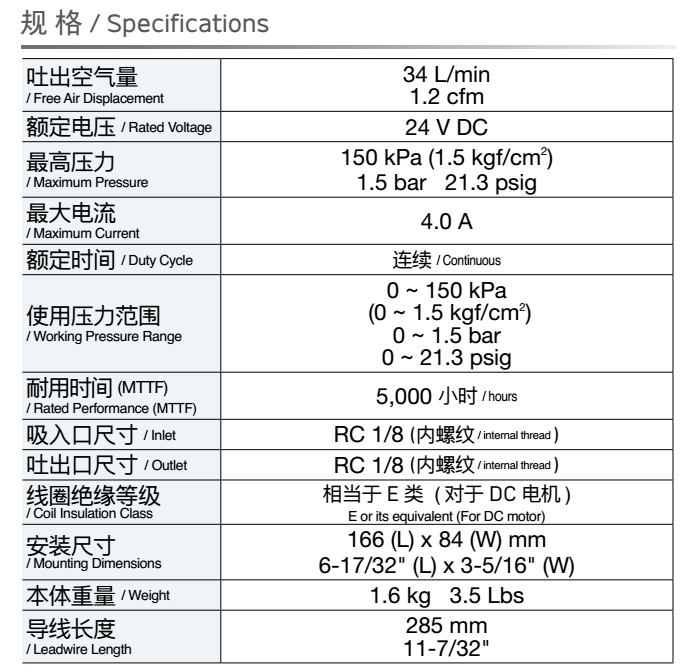 額定壓力: 100 kPa (1.0 kgf/cm2<br /> 最大壓力: 120 kPa (1.2 kgf/cm2)<br /> 吐出空氣量: 1.0 L/min ※<br /> 額定電壓: 24V