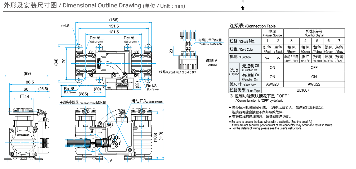 額定壓力: -26.6 kPa (-200mmHg)<br /> 最大壓力: 45 kPa (0.45 kgf/cm2)<br /> 吐出空氣量: 5 L/min<br /> 額定電壓: 12 V DC