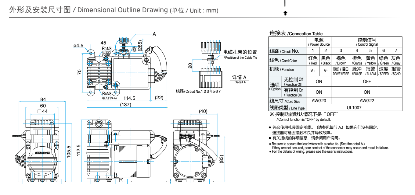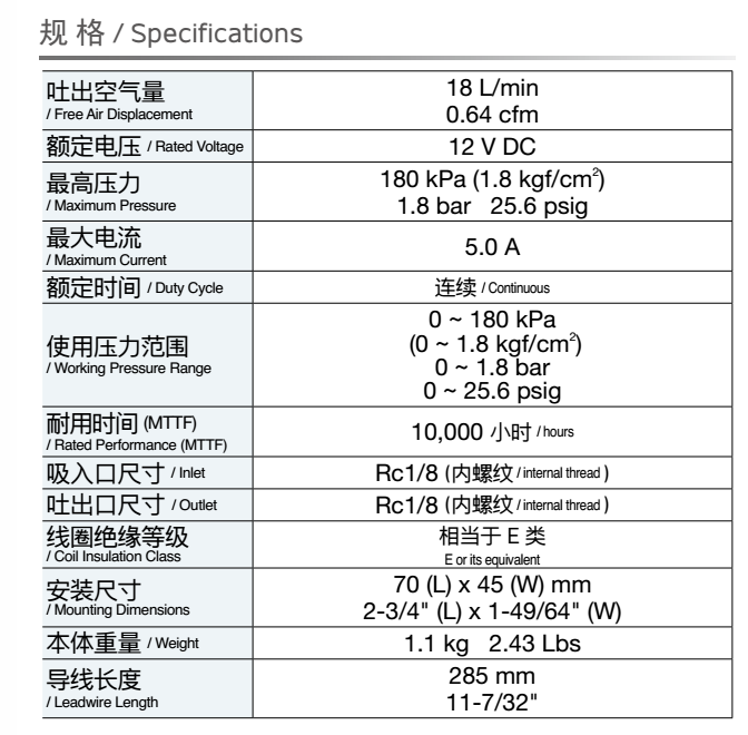 額定壓力: 100 kPa (1.0 kgf/cm2<br /> 最大壓力: 120 kPa (1.2 kgf/cm2)<br /> 吐出空氣量: 1.0 L/min ※<br /> 額定電壓: 12V