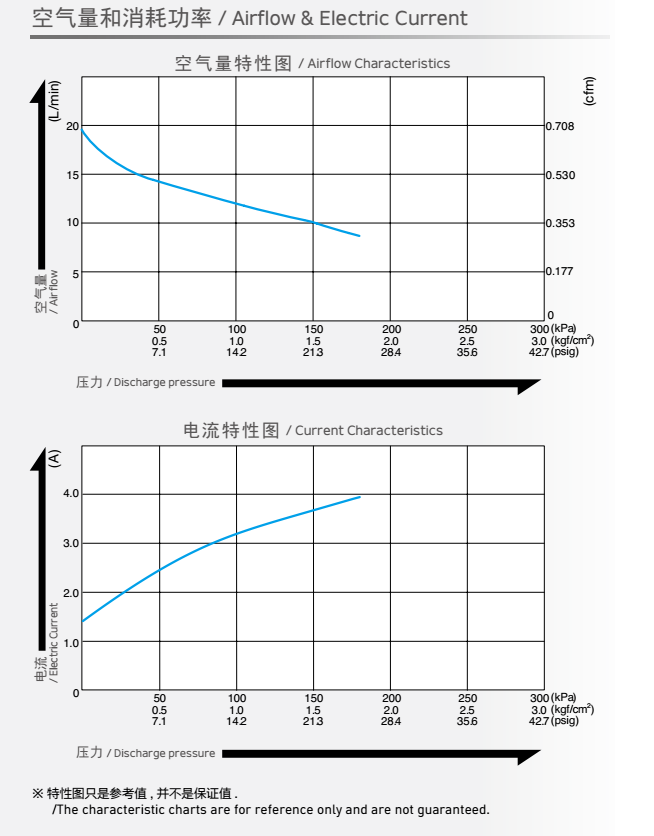 額定壓力: 100 kPa (1.0 kgf/cm2<br /> 最大壓力: 120 kPa (1.2 kgf/cm2)<br /> 吐出空氣量: 1.0 L/min ※<br /> 額定電壓: 24V
