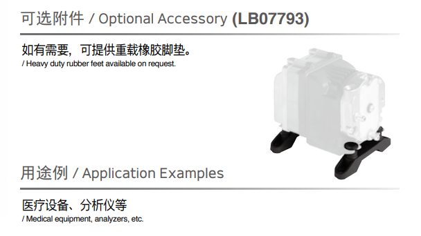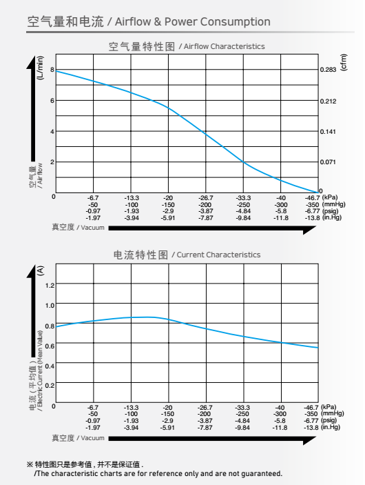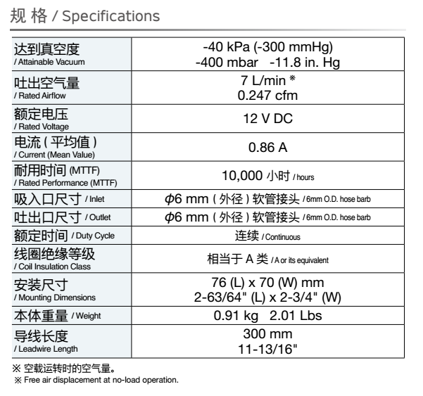 額定壓力: -26.6 kPa (-200mmHg)<br /> 最大壓力: 45 kPa (0.45 kgf/cm2)<br /> 吐出空氣量: 5 L/min<br /> 額定電壓: 12 V DC