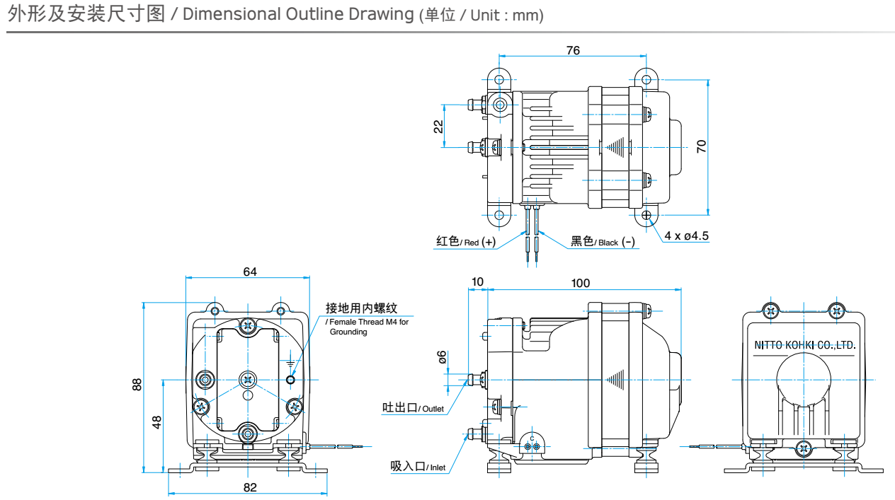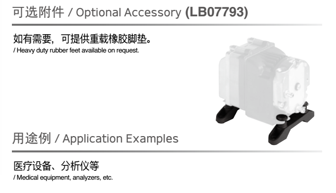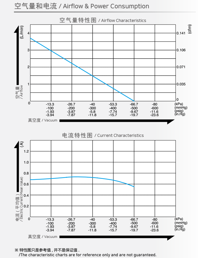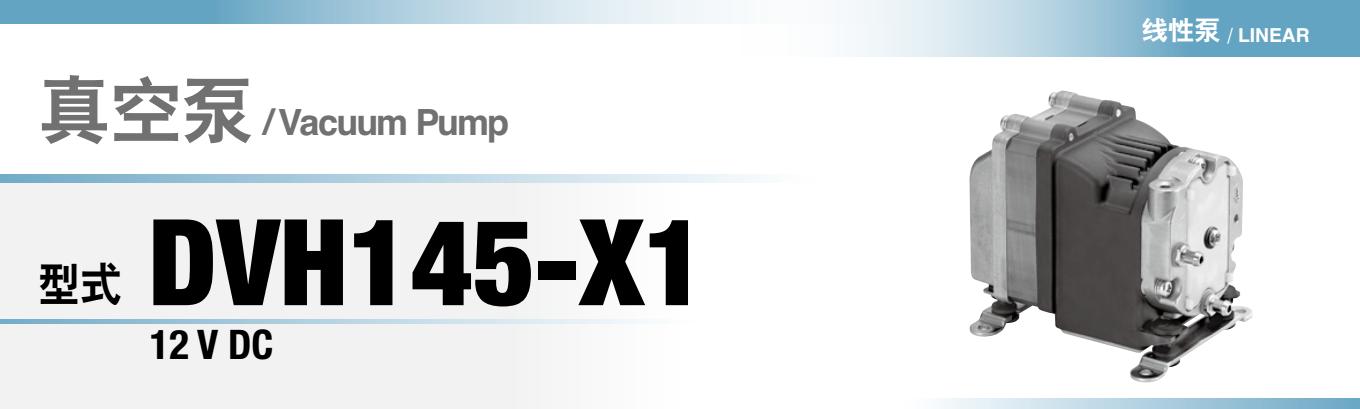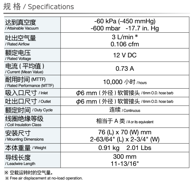 額定壓力: -26.6 kPa (-200mmHg)<br /> 最大壓力: 45 kPa (0.45 kgf/cm2)<br /> 吐出空氣量: 5 L/min<br /> 額定電壓: 12 V DC