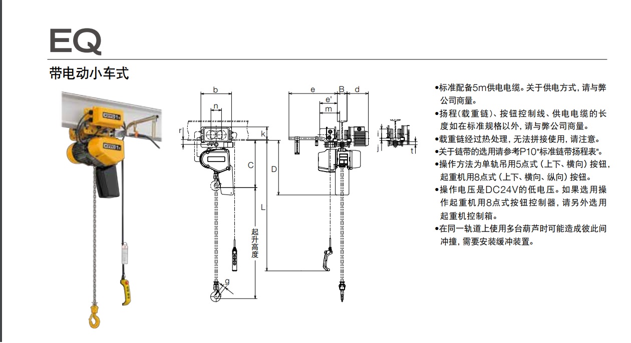 EQ 系列產(chǎn)品能夠大限度地發(fā)揮其核心 ——雙速變頻器的特性,從控制到機械設計的各個細節(jié), 均采用 KITO 技術。 采用馬達座與本體一次成型結構,在確保強大功能的同時, 實現(xiàn)本體輕便、小巧。 標準配置中采用電子式超載保護與摩擦離合器, 實現(xiàn)雙重安全保障,并且低碳環(huán)保。 按壓式按鈕開關,操作簡單、輕便易用。 標準配置無負荷高速運行功能,提高作業(yè)效率。