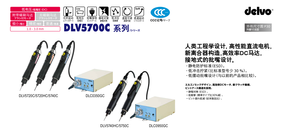 人類工程學設計,高性能直流電機, 新離合器構(gòu)造,高效率DC馬達, 接地式的批嘴設計。 ·靜電防護標準(ESD)。 ·低沖擊擰緊(比標準型號少 30 %)。 ·低擺動批嘴設計(與以前的產(chǎn)品相比較)。
