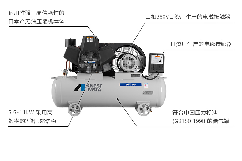 采用完全不用潤滑油的免供油方式,空氣和排水中不含油份,可以始終保持空氣清潔。無需日常的潤滑管理,免除了油霧和管路 的困擾。