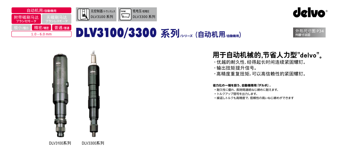 用于自動機械的,節(jié)省人力型"delvo"。 ·優(yōu)越的耐久性、經(jīng)得起長時間連續(xù)緊固螺釘。 ·輸出扭矩提升信號。 ·高精度重復扭矩,可以高信賴性的緊固螺釘。