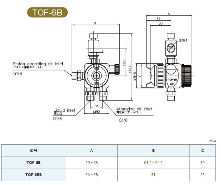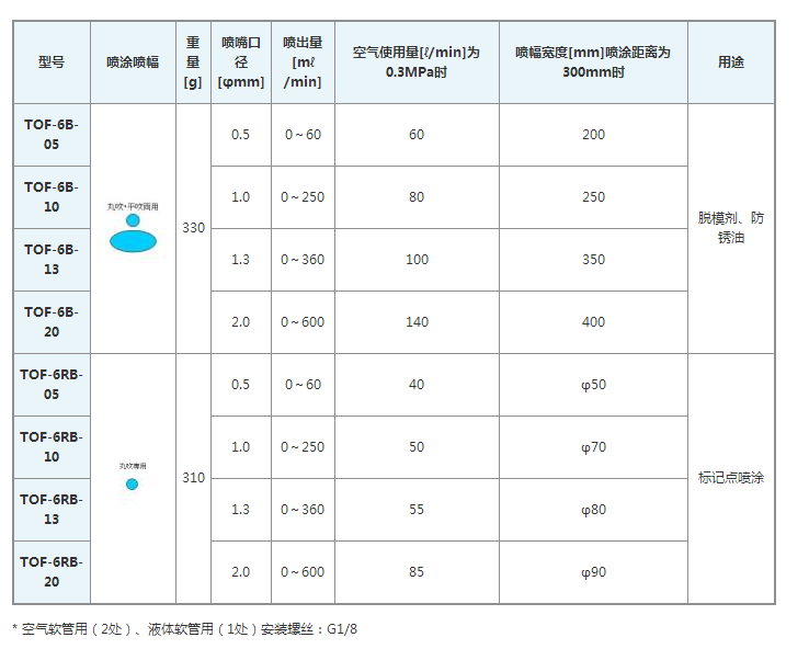TOF-6B可通過噴幅調(diào)整裝置進(jìn)行平噴~圓噴調(diào)整。(TOF-6RB圓噴專用噴槍沒有噴幅調(diào)整裝置。)