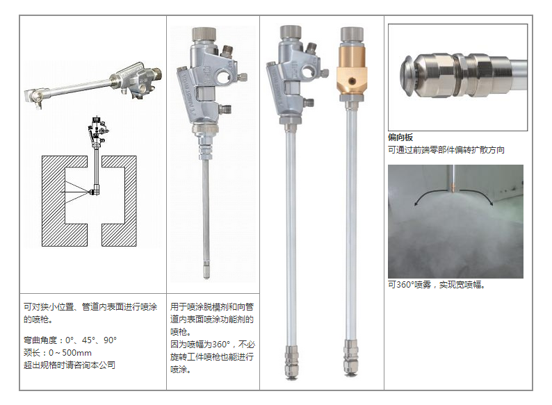 高效噴涂水、油、粘著劑、脫模劑、除臭劑、藥液等液體的噴槍。除了標(biāo)準(zhǔn)規(guī)格,還可根據(jù)客戶的要求生產(chǎn)特殊產(chǎn)品。 * 請不要將本商品用于食品?藥品等食用產(chǎn)品噴涂,其制造設(shè)備及噴槍的內(nèi)部腐蝕對人、動植物產(chǎn)生危害。