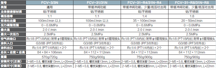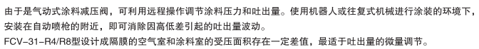 因?yàn)槭菤鈩?dòng)式涂料減壓閥,所以可以遙控操作,調(diào)整涂料壓力。 在機(jī)器人、往復(fù)噴涂機(jī)涂裝環(huán)境下,安裝到自動(dòng)噴槍旁邊,可以消除高低差導(dǎo)致的吐出量變動(dòng)。 由于隔膜的空氣室和涂料室的受壓面積不同,所以FCV-31-R4/R8最適合調(diào)整較少的吐出量。