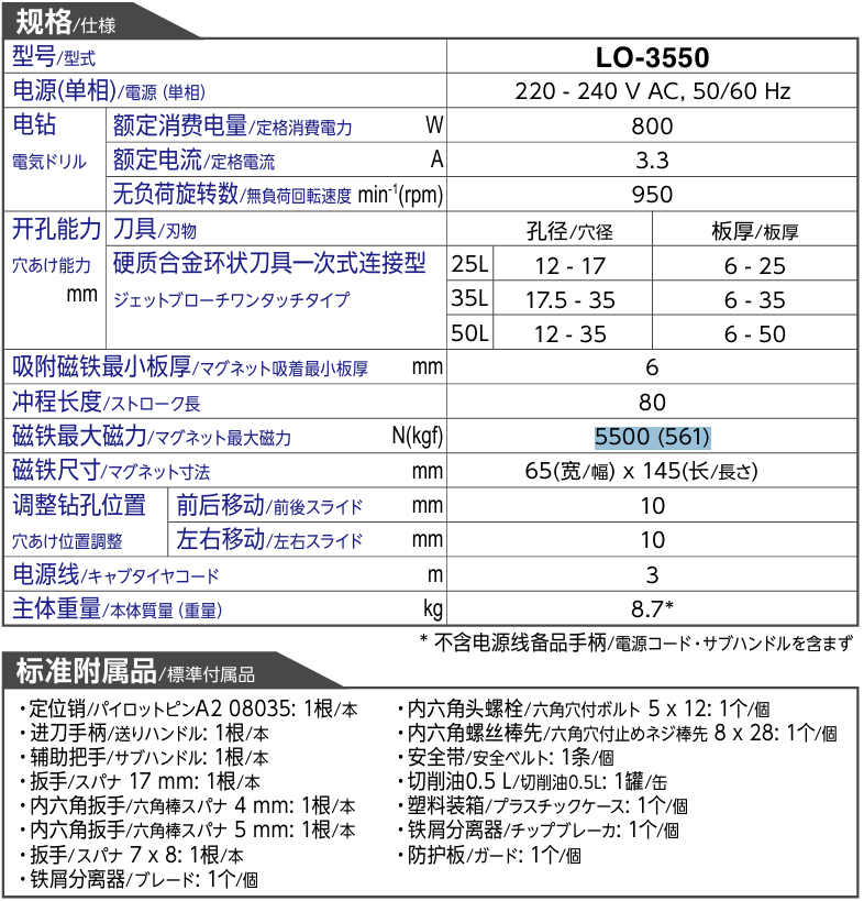 鉆孔孔徑: 12 ~ 27 mm<br> 板材厚度: 6 ~ 20 mm<br> 無負荷旋轉(zhuǎn)速: 430 (rpm)<br> 重量: 7 *kg