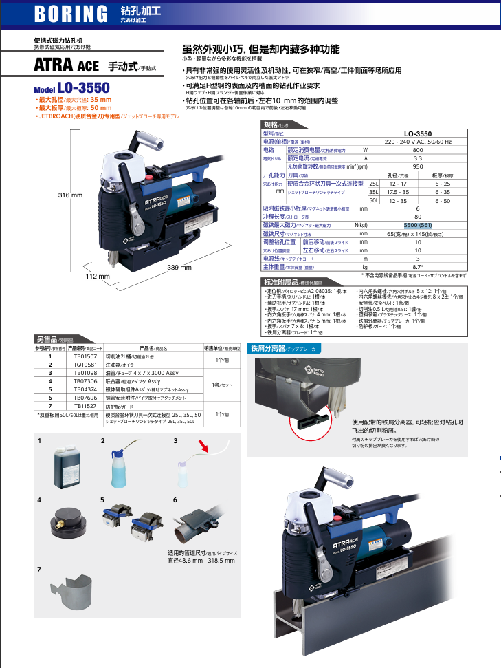 鉆孔孔徑: 12 ~ 50 mm<br> 板材厚度: 9 ~ 50 mm<br> 無負荷旋轉(zhuǎn)速: 無負荷旋轉(zhuǎn)速 350 / 650 rpm<br> 重量: 23 kg