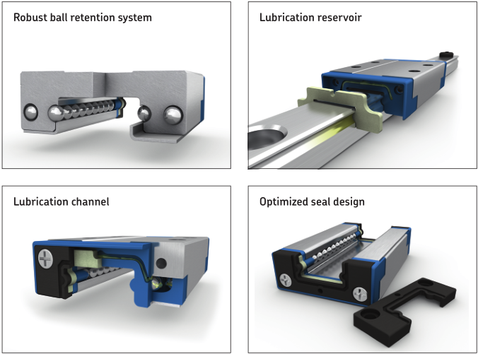 新設計的特點包括:新穎的封閉滾珠式再循環(huán)系統(tǒng),在組裝和存放的過程中,滾珠可以始終保持在適當?shù)奈恢茫_??梢苑奖愣喂贪惭b滑座;同時配備一個潤滑劑儲存盒,每次沖程過程中將潤滑劑輸送到滾珠處?;松w的密封件經(jīng)過特殊設計,可將潤滑劑封閉在滑座內(nèi),不會讓污染物從滾珠循環(huán)系統(tǒng)中排出。