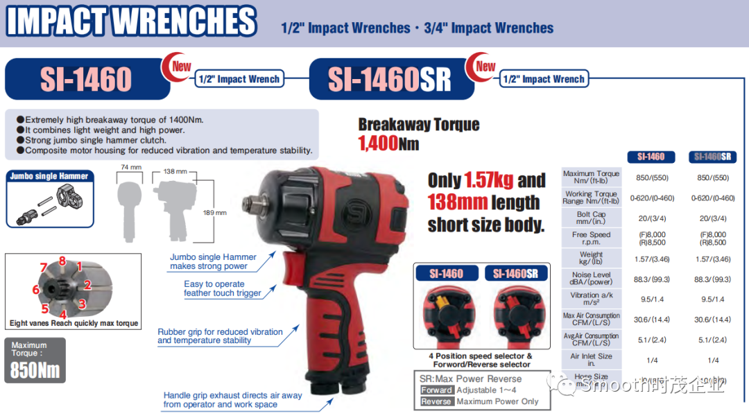 用一只手即可輕松切換前進和后退選擇器。橡膠握把可減少振動和溫度穩(wěn)定性。°旋轉(zhuǎn)進氣口可防止空氣軟管扭曲。易于輕觸啟動。
