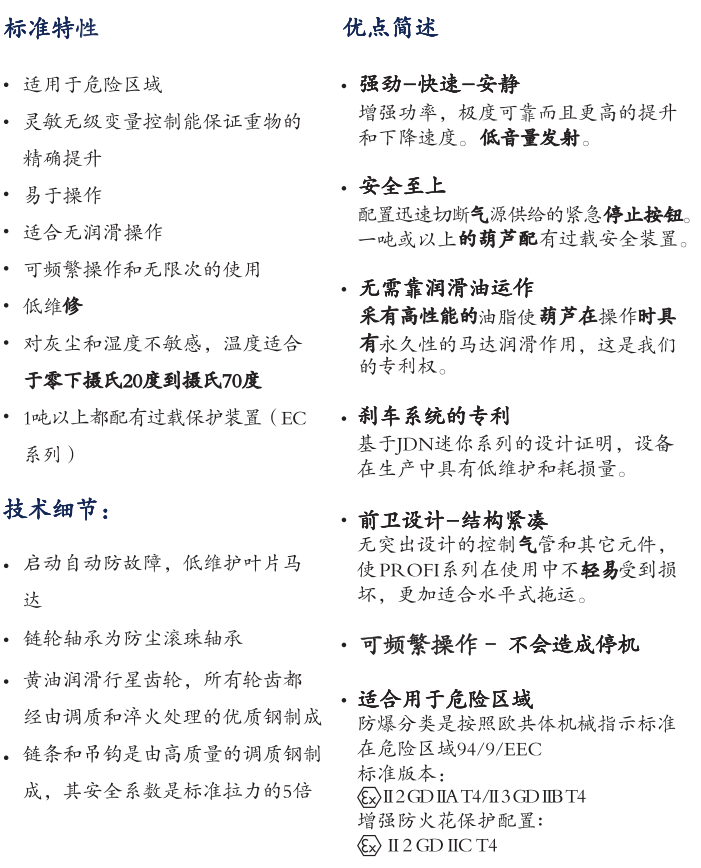 實踐證明,在任何以安全為優(yōu)先的環(huán)境中,JDN氣動葫蘆都是最佳選擇。相對于電流驅(qū)動來說,以壓縮氣體作為驅(qū)動媒介不會產(chǎn)生任何電火花。這種結(jié)構(gòu)的特點使,JDN氣動葫蘆特別適合在有危險的環(huán)境中工作。
