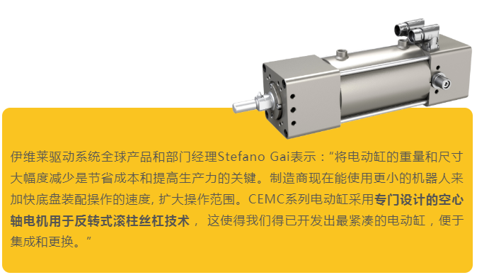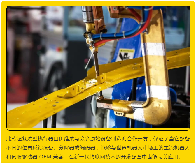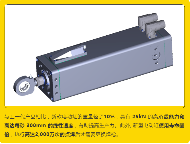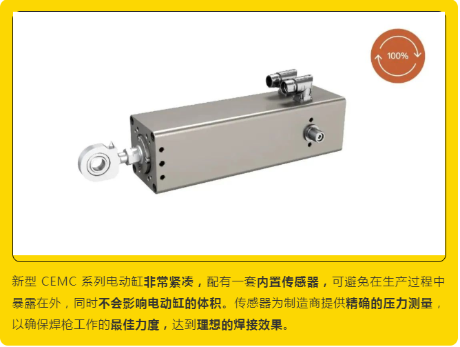 汽車行業(yè)是工業(yè)機器人的主要用戶,每條裝配線上平均有300臺焊接機器人運行工作,這些機器人中的大多數(shù)使用氣動驅(qū)動裝置來夾持和焊接汽車底盤上的指定點。伊維萊(原名SKF Motion Technologies)采用專門的機電一體化設計為機器人焊接工藝開發(fā)了一種新型CEMC系列緊湊型電動缸,使用此款電動缸比氣動裝置更為可靠、節(jié)能,且僅需要氣動工藝所需的小部分能量即可提供系列優(yōu)勢,可為汽車制造商帶來更佳的靈活性、生產(chǎn)力和成本效益。